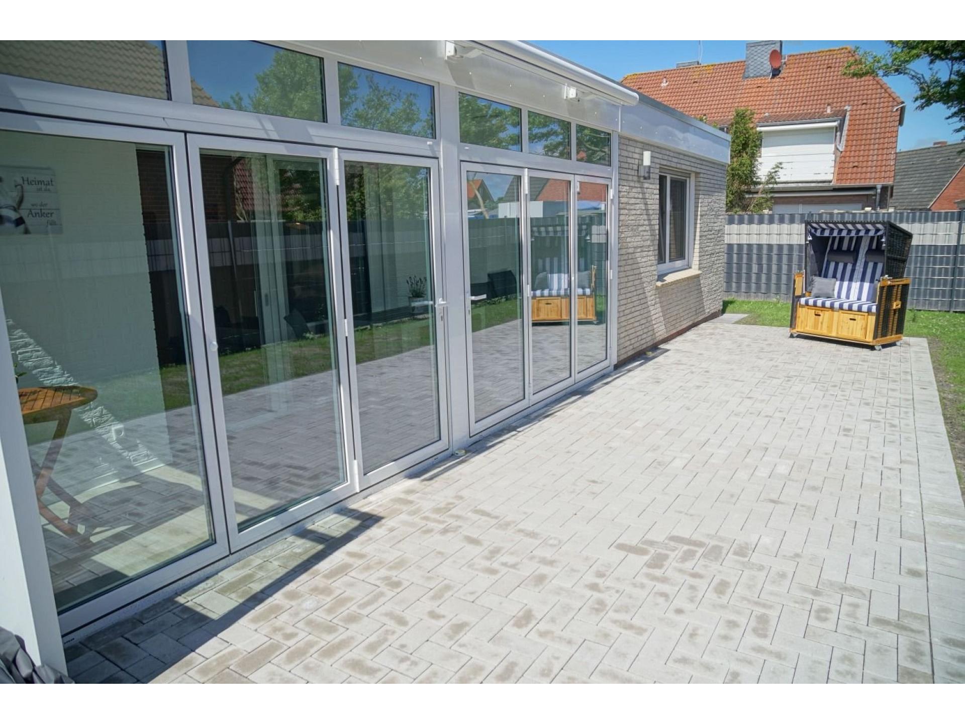 | Auf der Terrasse oder dem kleinen Sommergarten den Sie durch das Wohnzimmer erreichen können Sie den Abend gemütlich ausklingen lassen. Hier finden einen Sonneschirm und Strandkorb sowie Gartenmöbel zum entspannen. |